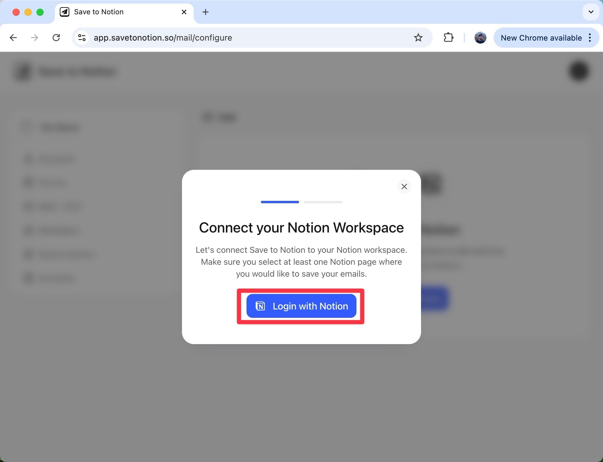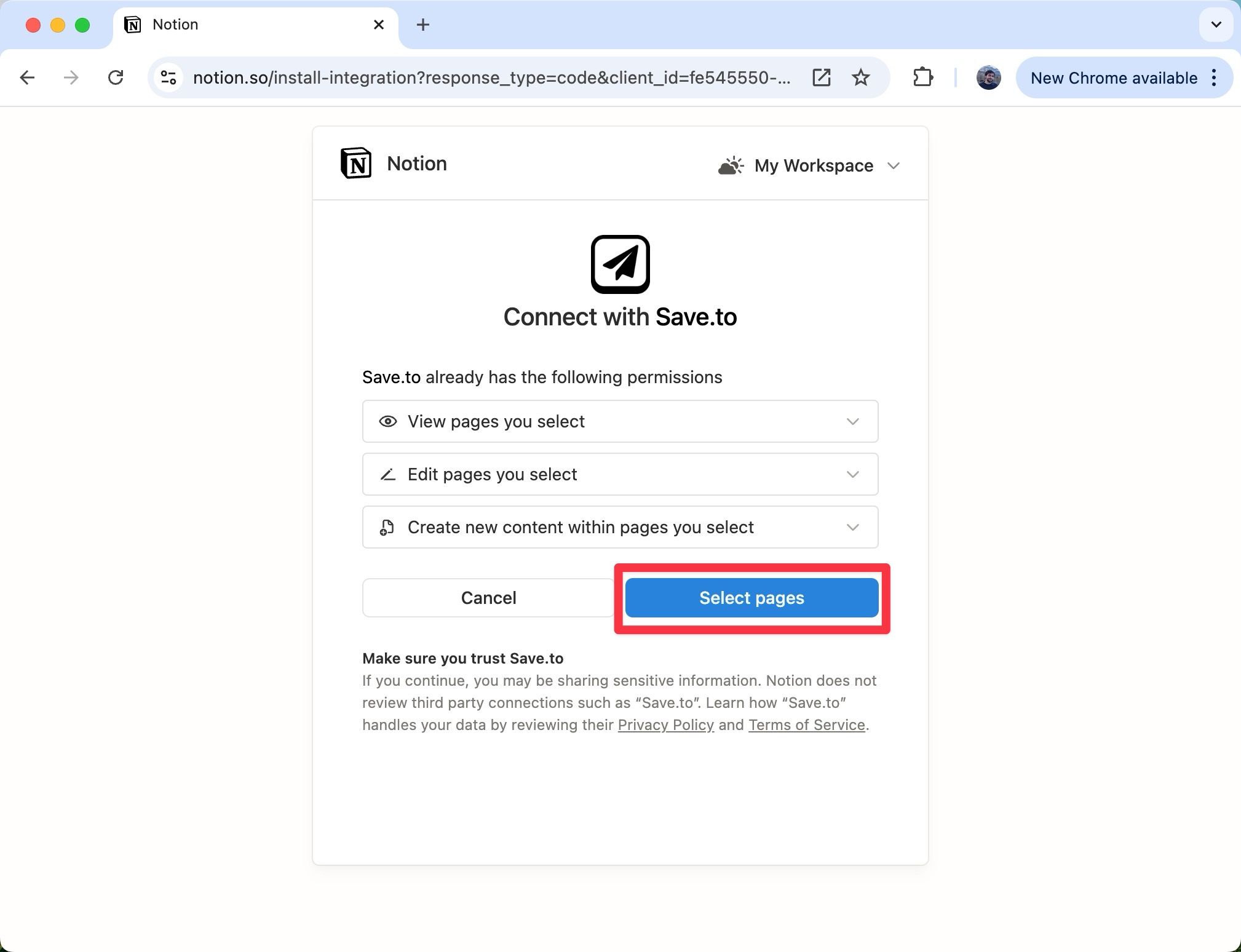 You'll be redirected to Notion. Click "Select pages" and pick at least one database or page where your emails should be saved.