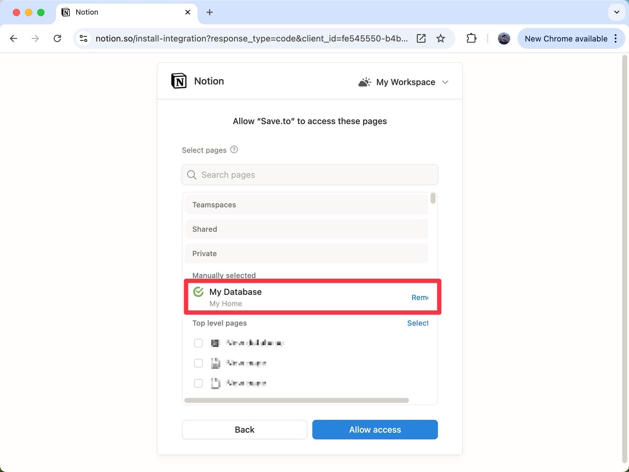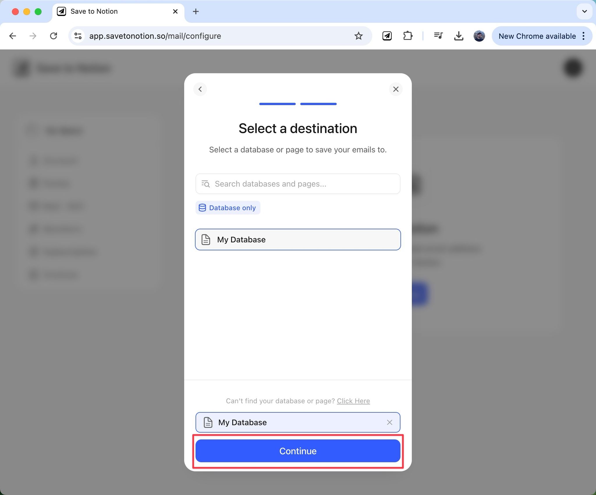 Back in the Save to Notion dashboard, select the destination from the list (in this example, "My Database") and press "Continue".