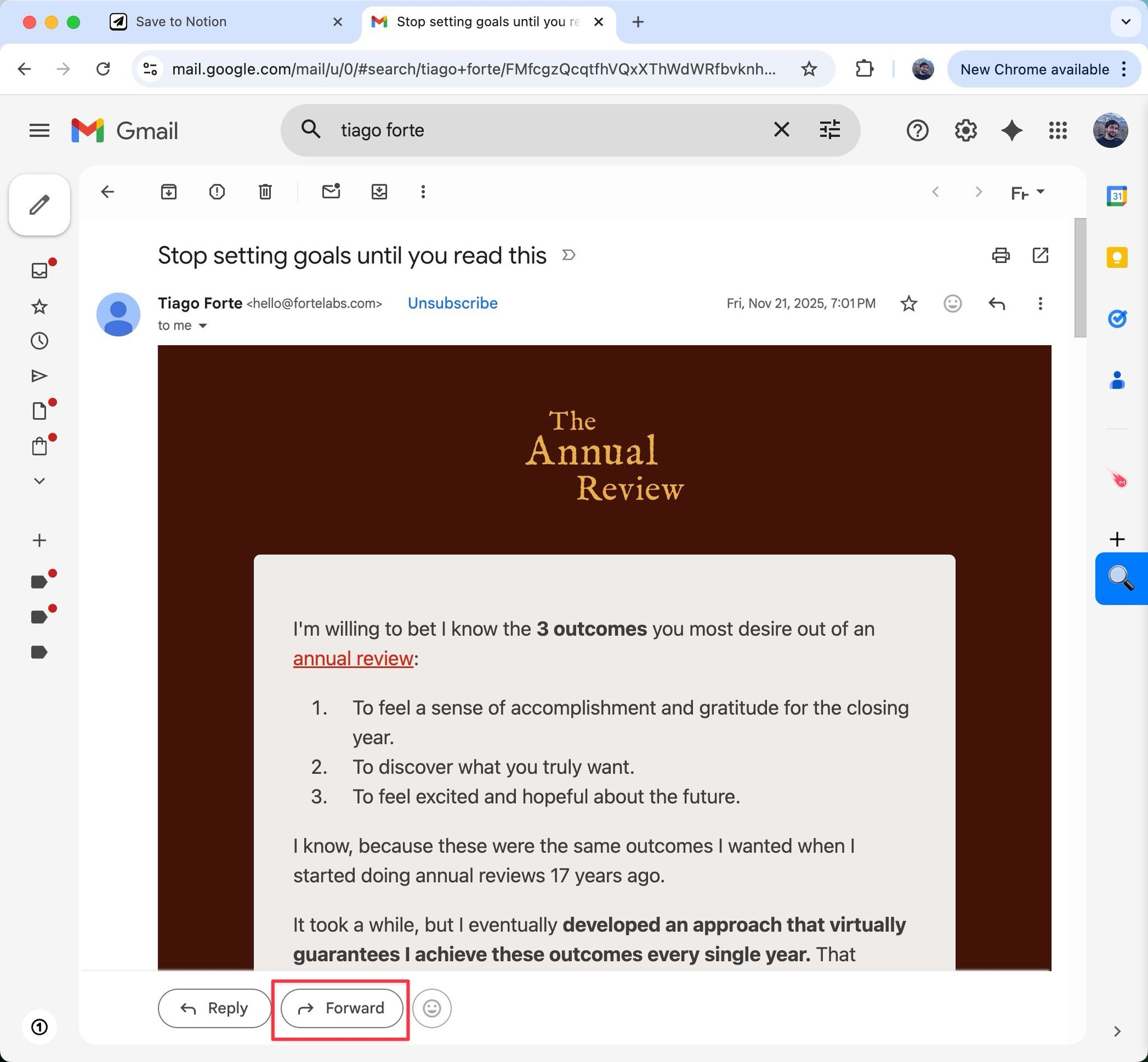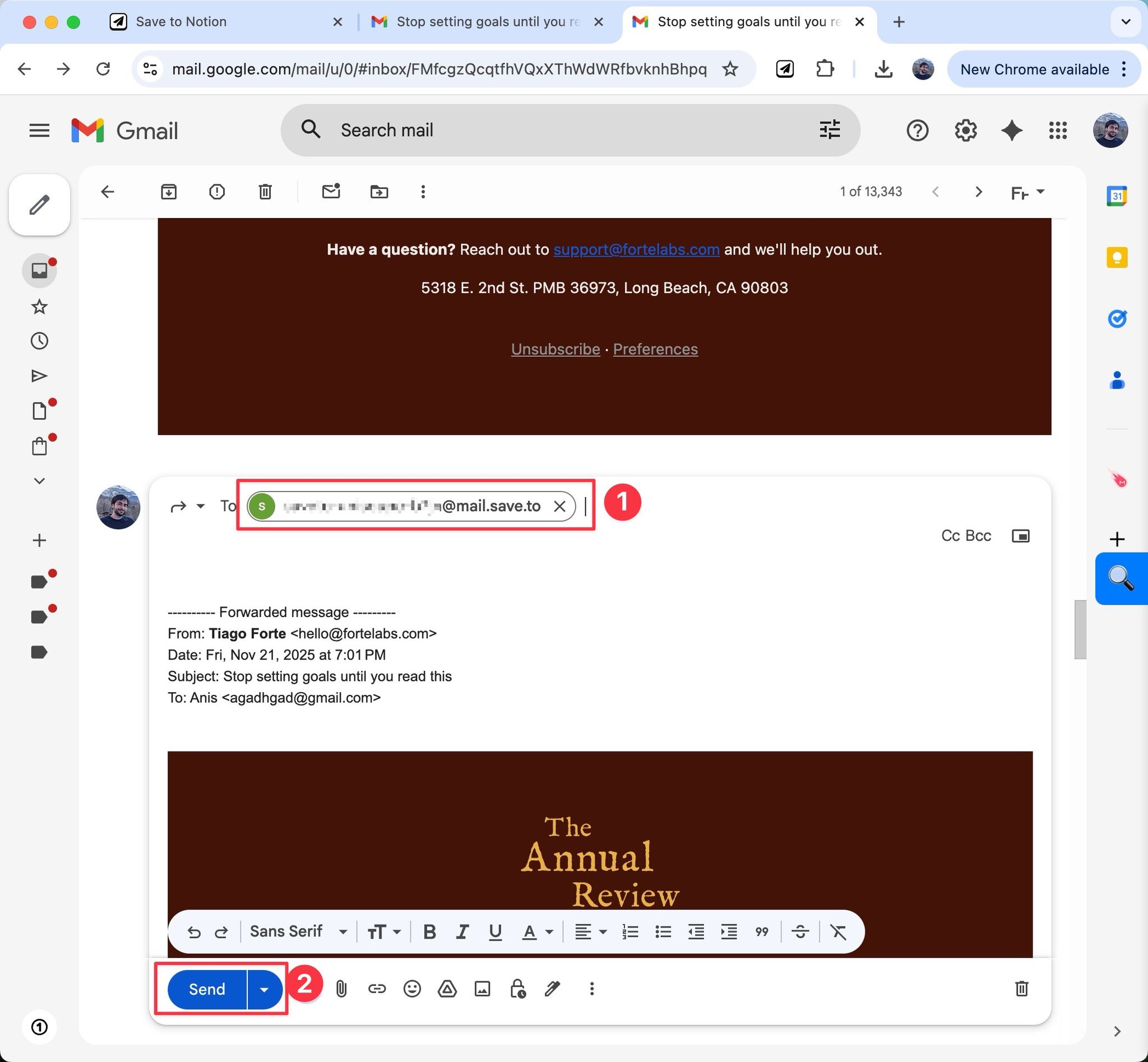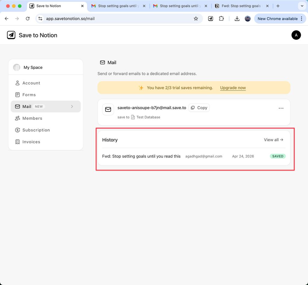 Save to Notion can also be used to save any email directly to your Notion workspace by simply forwarding it to your own dedicated address. This is particularly useful for archiving newsletters, receipts, or any valuable email content you'd like to keep alongside your other notes. Here's a simple guide on how to set it up.