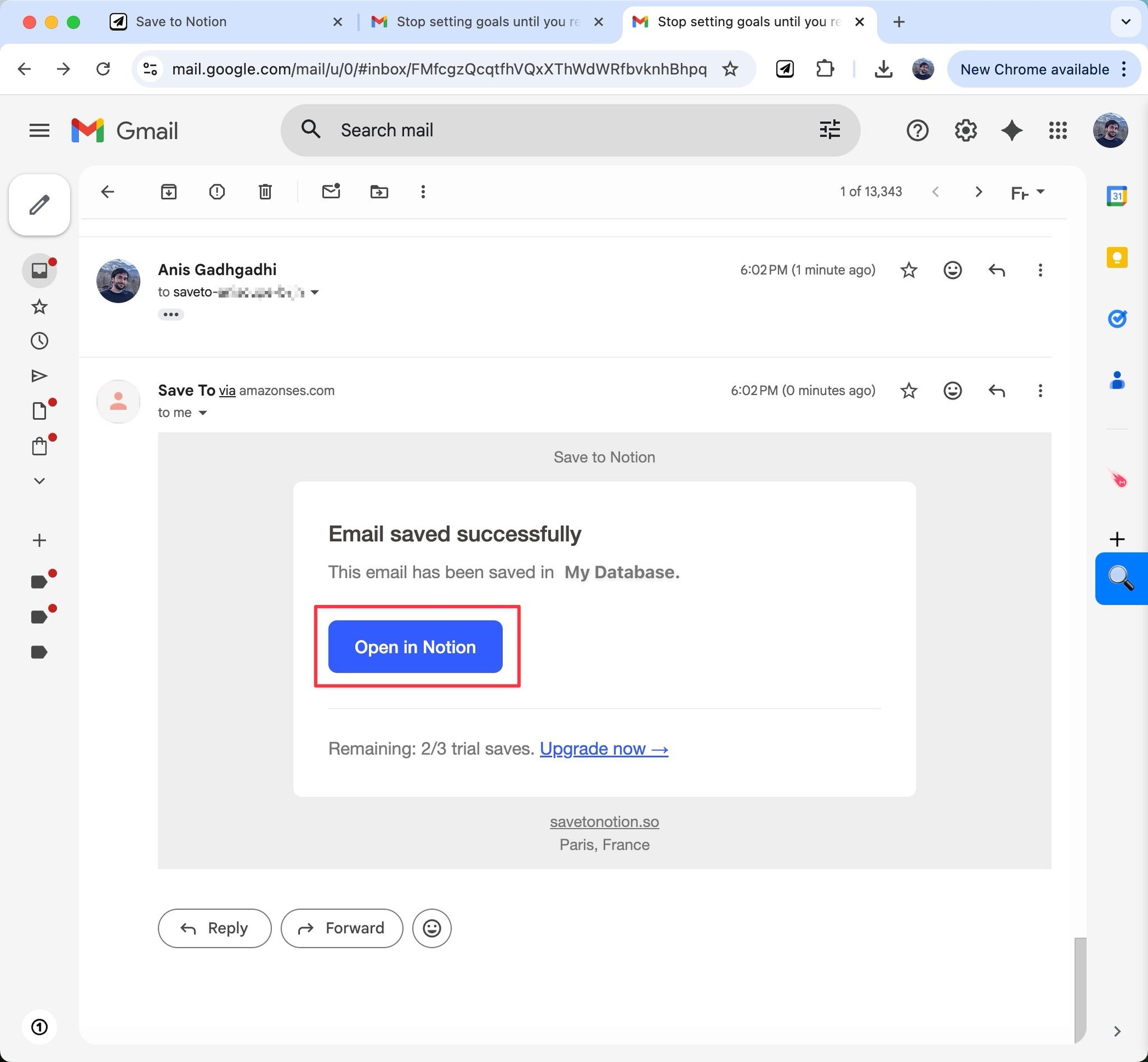 Within a few seconds, you'll receive a confirmation reply letting you know your email has been saved. Click "Open in Notion" to jump straight to the new page.