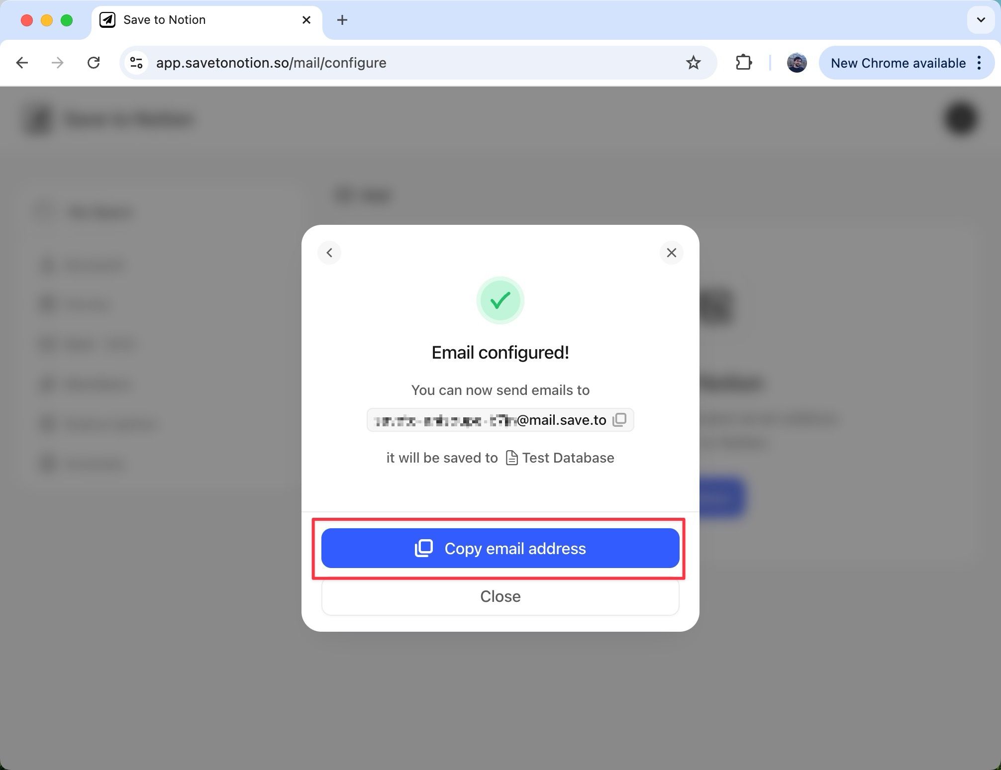 Your dedicated email address is now ready. Copy it to your clipboard — this is the address you'll forward emails to.